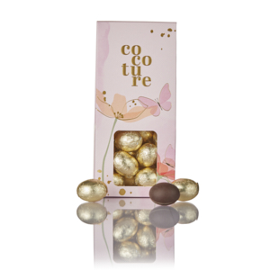 SmagOgGodt.dk fandt Cocoture æske med fyldte folieæg – 95-100g fra Cocoture til 51.00 DKK i kategorien Home > Påske hos Cocoture.dk. Nye todelte chokoladeæg i flødechokolade og pistacie indpakket i guldfolie. Leveret i lyserød Cocoture dragébox med blomster. 95-100g